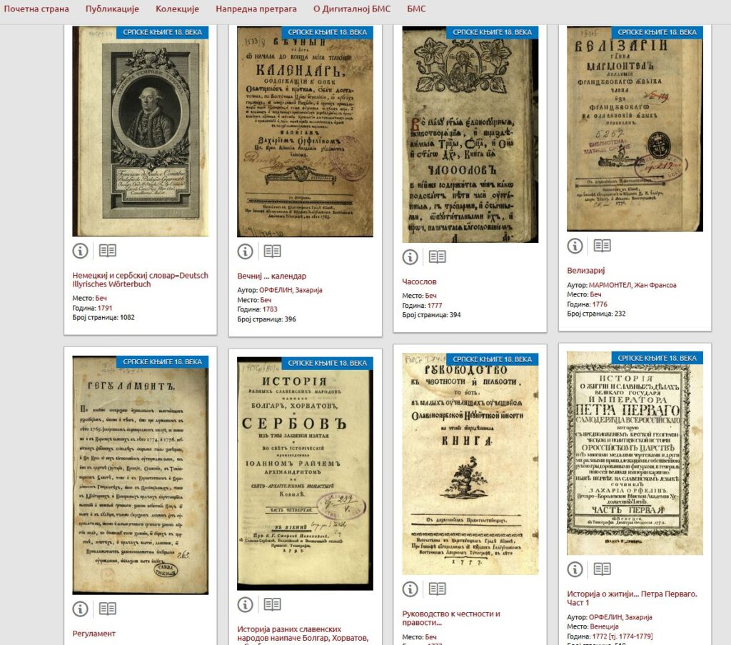 O sadržajnoj vrednosti kolekcija može poslužiti podatak da je od oko 480 knjiga koje je dao srpski 18. vek na sajtu dostupno 280 naslova izuzetne vrednosti koje je sada moguće pregledati i proučavati u onlajn režimu uz pomoć opcije Prelistajte. Ovim je omogućeno da čitav niz delatnika srpskog prosvetiteljstva poput Jovana Rajića, Zaharija Orfelina, Lukijana Mušickog, Pavla Solarića, Atanasija Stojkovića, Dositeja Obradovića, Milovana Vidakovića, bude približen savremenim pokolenjima. Sa izuzezkom Dositeja Obradovića, oni su uglavnom zaboravljeni zbog spora oko modifikacije srpskog jezika i potisunuti kao protivnici reforme za koju se zalagao Vuk Karadžić. Delo Jovana Rajića, koji je utemeljio razvoj novovekovne srpske istoriografije zastupljeno je sa 32 naslova. Među njima je i znamenita četvorotomna ”Istorija raznih slovenskih naroda, posebice Bugara, Hrvata i Srba”, u svom prvom izdanju iz 1794/95, i drugom iz 1823/24. U tom svom delu Rajić je uspešno sintetisao i uveliko nadmašio dotadašnju istorijsku tradiciju, „srpskoj istoriji dao izgubljeni početak“ i u skladu sa evropskom vizijom istorije – hronloškom podelom na staro, srednje i novo doba – srpsku istoriju izvodio od prelomnog vremena Seobe naroda.