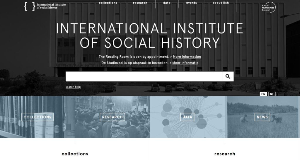 Veb prezentacija Međunarodnog instituta za socijalnu istoriju u Amsterdamu sadrži nekoliko značajnih i korisnih odeljaka koji korespondiraju sa bogatom arhivskom, bibliotečkom i audio-vizuelnom građom koja su čuva u ovoj instituciji za proučavanje socijalno-ekonomske istorije. Pored mogućnosti detaljne pretrage i informacija o građi u formi elektronskog kataloga, gde su podaci strukturirani prema vrsti građe, arhivskim celinama i prema državama, na sajtu je omogućen pristup i drugim digitalnim sadržajima, poput pretrage onlajn kolekcija, od kojih su mnoge digitalizovane i slobodno dostupne. U podsekcijama odeljka o podacima (Data) omogućen je uvid u različite baze podataka pohranjene u sistemu Dataverse (Radni odnosi, Produkcija novca, Ruska istorijska statistika, Španski građanski rat, Jugoistočna Azija, Holandski izborni cenzus, Međunarodni klasifikacioni sistem religija i dr). Tu se nalazi i konvertor uporedne vrednosti novca (gulden i evro) i kupovne moći kroz vreme. Treba istaći i blog sajta koji je pomalo skrajnut unutar odeljka O Institutu (about iish), ali je veoma bogat objavama grupisanim u nekoliko kategorija, kao što su novosti o azijskim kolekcijma, ili publikacije i naučni rezultati nastali na temelju korišćenja kolekcija Instituta. Za oblast digitalne istorije naročito je interesantan blog o digitalnim tokovima rada (Digital Workflows Blog), ili o Međunarodnom udruženju za socijalnu istoriju (ISHA) koje je osnovano na kongresu u Sidneju 2005. godine (na ovoj stranici se mogu preuzeti/ i bilteni ISHA od 2011. do 2018. godine).