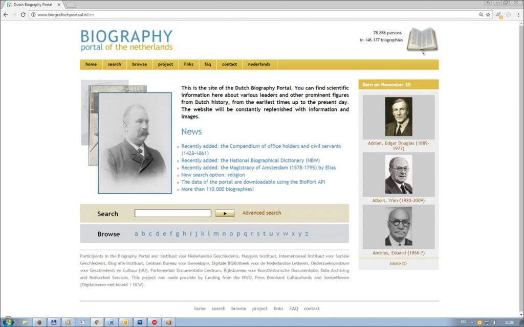 Holandski biografski portal sadrži preko 110.000 biografija znamenitih ličnosti iz holandske istorije, od najstarijih vremena do savremenog doba. Projekat je nastao u saradnji nekoliko institucija iz oblasti društvenih nauka i zaštite kulturnog nasleđa na čelu sa Institutom za holandsku istoriju, koji održava sajt i rukovodi fondacijom koja se stara o njegovom održavanju. Bazu ličnosti je moguće pretraživati u odeljku za naprednu pretragu ili pregledati abecednim redom. Skrećemo pažnju na odeljak sa preporučenim linkovima zato što sadrži veze ka sajtovima specijalizovanim za biografije u drugim državama. Ovaj biografski portal je nastao sabiranjem podataka iz štampanih radova i podataka razasutih širom interneta, a sa tehničke strane za izradu baze je korišćen BioDes – XML format za prezentaciju biografskih informacija na internetu, dok je standard usaglašen u saradnji sa partnerima učesnicima.