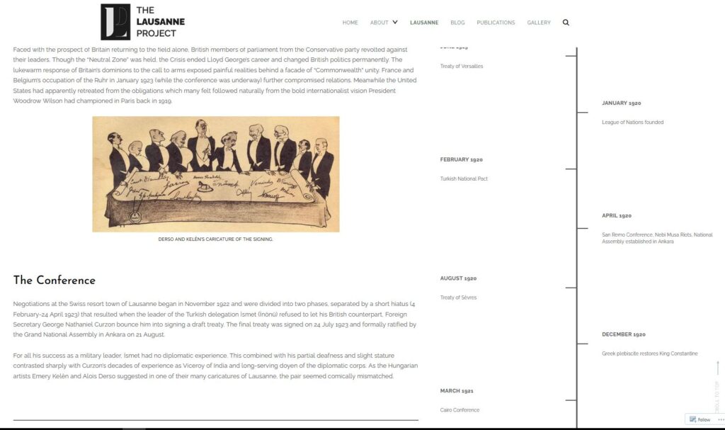 Lozanskim mirom potpisanim 24. jula 1923. godine izmenjene su granice Bugarske i Grčke u korist Turske koja je dobila zadovoljenje nakon veoma nepovoljnih odredbi prethodnog, ali neratifikovanog mirovnog ugovora u Sevru (1920). Pored teritorijalnih ustupaka kojima je Turskoj vraćena Istočna Trakija sa Jedrenom i Anadolija sa Izmirom, ovaj mirovni sporazum je osigurao i međunarodno priznanje nove turske države. Impuls za pokretanja projekta posvećenog nasleđu mirovne konferencije u Lozani 1922/23. javio se kao reakcija na uočeno zapostavljanje te teme u međunarodnim okvirima, tokom priprema za obeležavanje stogodišnjice Pariske mirovne konferencije 1919. godine. Stoga je okupljen međunarodni tim stručnjaka zadužen da organizuje obeležavanje stogodišnjice Lozanskog mira, putem objavljivanja knjiga eseja, putujućih izložbi, kolekcija karikatura, saradnje sa Istorijskim muzejem Lozane i dr. Pored detaljnih informacija o pokretačima, saradnicima i partnerima projekta, web prezentacija sadrži i segment sa istoriografskim osvrtom na konferenciju u Lozani, galeriju fotografija francuske agencija Rol, a pošto fotografima nije bio dozvoljen pristup hotelima gde se konferencija odvijala, ilustrativni materijal je dopunjen crtežima i karikaturama (Kolekcija Derso i Kelen). Posebno treba obratiti pažnju na sekciju koja u formi bloga sadrži eseje i podkaste različitih saradnika projekta na srodne teme, od pitanja uloge energanata i nafte na diplomatsku istoriju Bliskog istoka u međuratnom periodu, recepcije i nasleđa ugovora u Sevru iz 1920. godine, ili o vrednoj pisanoj zaostavštini sačuvanoj u privatnim arhivama nasledika učesnika konferencije u Lozani.