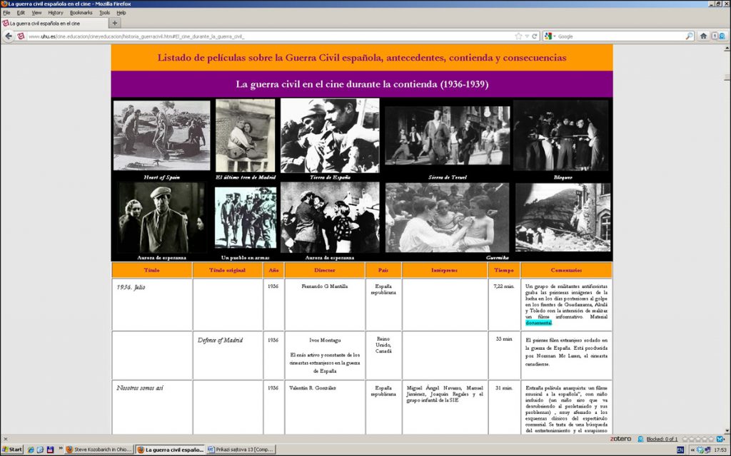 U okviru španske prezentacije posvećene filmu i obrazovanju kreirana je i stranica o Španskom građanskom ratu na filmu gde autori predlažu i analiziraju niz filmova koji mogu da posluže kao referentni za diskusiju i proučavanje Španskog građanskog rata, ističući činjenicu da se građanski rat koji je duboko podelio špansko društvo odrazio i na različita gledišta na ovaj sukob na velikom ekranu. Iako svesni da je teško sačuvati objektivnost o ovakvoj tragediji, takođe je istaknuta i potreba o negovanju istorijskog pamćenja i putem filmskih zapisa, kako onih nastalih već za vreme samog rata, tako i do filmova današnjeg vremena. U tabelarnoj formi, u hronološkom nizu od 1936 do 2011. god, ovde je dato nekoliko desetina filmova sa opštim podacima i komentarima. Na kraju je dat i spisak preporučene literature na temu filma i njegovog odnosa prema Španskom građanskom ratu.