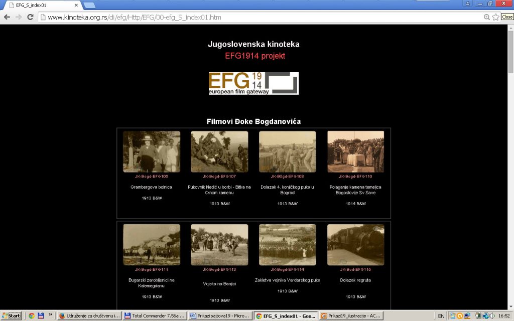 U sklopu velikog evropskog projekta European Film Gateway 1914 u okviru koga je od februara 2013. omogućen onlajn pristup za oko tri hiljade filmova na temu Prvog svetskog rata, nalazi se i izuzetna kolekcija iz fondova Jugoslovenske kinoteke u količini od šezdeset osam filmova. Dostupna kolekcija je podeljena u tri celine: Filmovi Đoke Bogdanovića (16), Dokumentarni filmovi (38), Igrani filmovi (14). U godinama obeležavanja stogodišnjice Prvog svetskog rata, učešće Jugoslovenske kinoteke u ovako značajnom projektu, sa rezultatom onlajn pristupa korisnicima širom sveta putem interneta, zaslužuje svaku pohvalu.