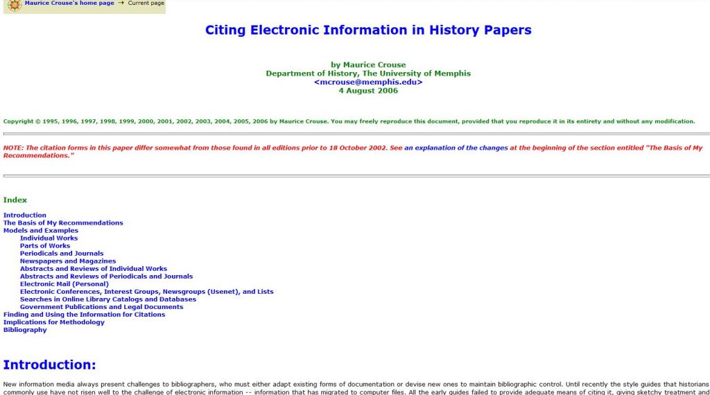 Najvažnija posledica koja se javlja pri prezentaciji istorijskih radova u različitim formatima u elektronskom obliku, posebno u HTML-u (kada se ceo sadržaj nekog dokumenta nalazi na samo jednoj stranici), tiče se problema citiranja. Poseban problem predstavlja i način ponovnog nalaženja podataka prezetih sa Web-a (npr. radi provere) usled povremenog ažuriranja (update-a), promene adrese, prestanka postojanja stranice i dr. Zbog ovog i drugih problema veliki broj istraživača smatra da se podaci preuzeti sa Interneta ne mogu koristiti u naučnim radovima, sve dok se pitanje citiranja sa Interneta ne reši na odgovarajući način. Moris Krouz (Maurice Crouse) sa Odeljenja za istoriju Univerziteta u Memfisu uhvatio se u koštac sa ovim gorućim problemom savremene istoriografije. Već više od jedne decenije on redovno objavljuje dopunjenu verziju vodiča za citiranje elektronskih informacija u istorijskim radovma, pokušavajuće da pronađe što adekvatnije rešenje problema. U ovoj raspravi čitalac se može upoznati sa osnovnim dilemama sa kojima se susreću istraživači prilikom citiranja elektronskog materijala, kao i niz praktičnih saveta kako citirati knjige, članke, prikaze preuzete sa Interneta, elektronsku prepisku, i sl. Ne uzimajući sebi za cilj da nametne neko od ponuđenih rešenja Krouz će svakako uticati na svakoga ko se makar jednom susreo sa problemom kako da svome elektronskom izvoru da zadovoljavajuću formu pri citiranju.