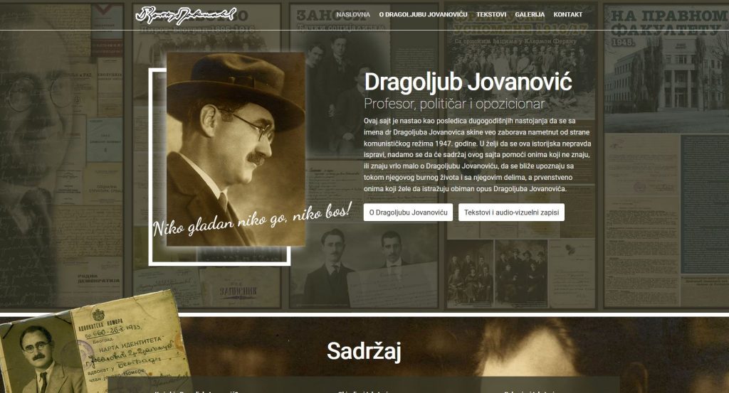Uzimajući u obzir da web prezentacije posvećene pojedinim istorijskim ličnostima nisu uobičajene u ovdašnjem sajber prostoru, sajt posvećen životu i delu srpskog naučnika, univerzitetskog profesora i političara Dragoljuba Jovanovića (1895-1977), već samom svojom pojavom potencijalno privlači pažnju publike. Iako bogatog i raznolikog sadržaja, sa više zanimljivih i korisnih sekcija, posetiocima sajta bi odmah trebalo ukazati da je u okviru neistaknute sekcije Dnevnik Dragoljuba Jovanovića sadržano elektronsko izdanje nedavno publikovanog dela u izdanju Istorijskog arhiva u Pirotu i porodice Dragoljuba Jovanovića (u sto primeraka). Dnevničke beleške u četiri toma obuvataju period od 1915. do 1973. godine, a za publikovanje ih je priredio istoričar dr Momčilo Isić, koji potpisuje i obimnu uvodnu studiju Dragoljub Jovanović i njegov dnevnik, na početku prvog toma. Pored toga što Dnevnik predstavlja osnovni izvor za izučavanje života i dela Dragoljubva Jovanovića, u njemu je sadržano i više hiljada imena ličnosti iz različitih oblasti društvenog života Jugoslavije, ali i sveta, pogotovo iz Francuske, u kojoj se Jovanović školovao. Preko sadržaja prezentacije izlistanog na početnoj strani sajta moguće je pristupiti i drugim tekstualnim i audio-vizuelnim zapisima, poput elektronske verzije doktorske disertacije Dragoljuba Jovanovića Optimalan prinos od radničkog rada odbranjenoj u Parizu 1923. godine, zatim pregleda rukopisnih tekstova, predavanja, objavljene i neobjavljene arhivske građe, literature, dokumenata iz arhiva porodice, rešenja o rehabilitaciji iz 2009. godine. Prezentacija sadrži i poseban link ka galeriji odabranih fotografija i drugih dokumenata. Povratak na početnu stranicu sajta sa bilo kojeg drugog mesta prilikom surfovanja je omogućen klikom na ikonu sa stilizovanim logom sa potpisom dr Dragoljuba Jovanovića u gornjem levom uglu ekrana. Jedino što bi se ovoj bez sumnje vrednoj i sadržajnoj prezentaciji moglo prigovoriti, to je možda ne baš najadekvatnije izabran domen sajta koji pogrešno upućuje na internet lokacije komercijalnog tipa (.com). Osim toga, bilo bi dobro dodati impresum sajta.