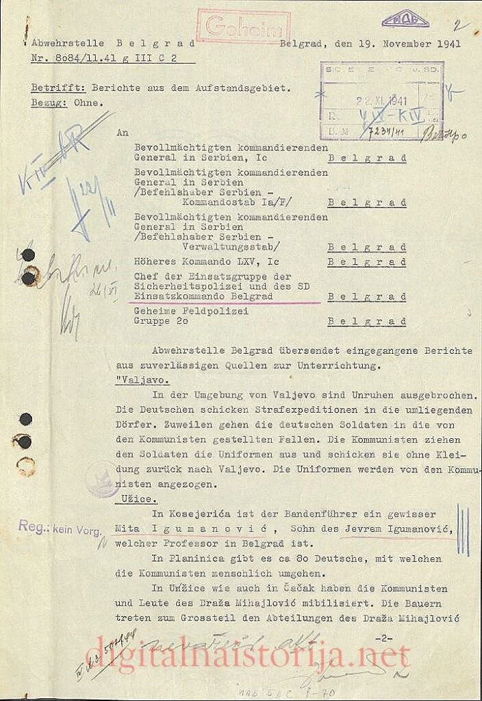 Događaji u Srbiji u jesen 1941. godine, vezani za ustanak protiv okupatora i početak otvorenih sukoba između partizanskih i četničkih jedinica, zabeleženi su i u jednom sačuvanom dokumentu, izveštaju nemačkih okupacionih snaga (Abwehrstelle — Ast), koju je potpisao potpukovnik Federići (Federici). Ovaj centar nemačke vojne i obaveštajne i kontraobaveštajne službe Abver-a (Abwehrstelle – Beograd) nije bio vezan ni za jednu organizacionu jedinicu Vermahta, a u početku je bio potčinjen direktno Obaveštajnoj i kontraobaveštajnoj upravi OKW (Oberkommando der Wehrmmacht), a potom odgovarajućem nadleštvu pri Komandantu Jugoistoka u Solunu. U vojnoobaveštajnom pogledu obrađivala je u početku čitavu Jugoslaviju, a potom sarno Srbiju. U oba slučaja imala je svoje ispostave (Nebenstelle, Aussenstelle) i obaveštajne punktove (Meldekopf) i agente (Vertrauensmann) i па teritoriji susednih zemalja. Prvi rukovodilac ustanove bio je upravo potpukovnik Federići, a potom pukovnik dr Kohutek (dr von Kohoutek). Ustanova je bila smeštena na Dedinju do rasformiranja u prvoj polovini 1944. godine, i nosila je kamuflirani naziv Štab za vezu oružanih snaga (Wermachtsverbindungsstab). Uz ovu ustanovu bila je vezana Specijalna ispostava nemačke Vrhovne komande za iskorištavanje arhivskih fondova vojnih i državnih organa Kraljevine Jugoslavije koja je u 1942. ili 1943. godini po izvršenju zadatka povučena.