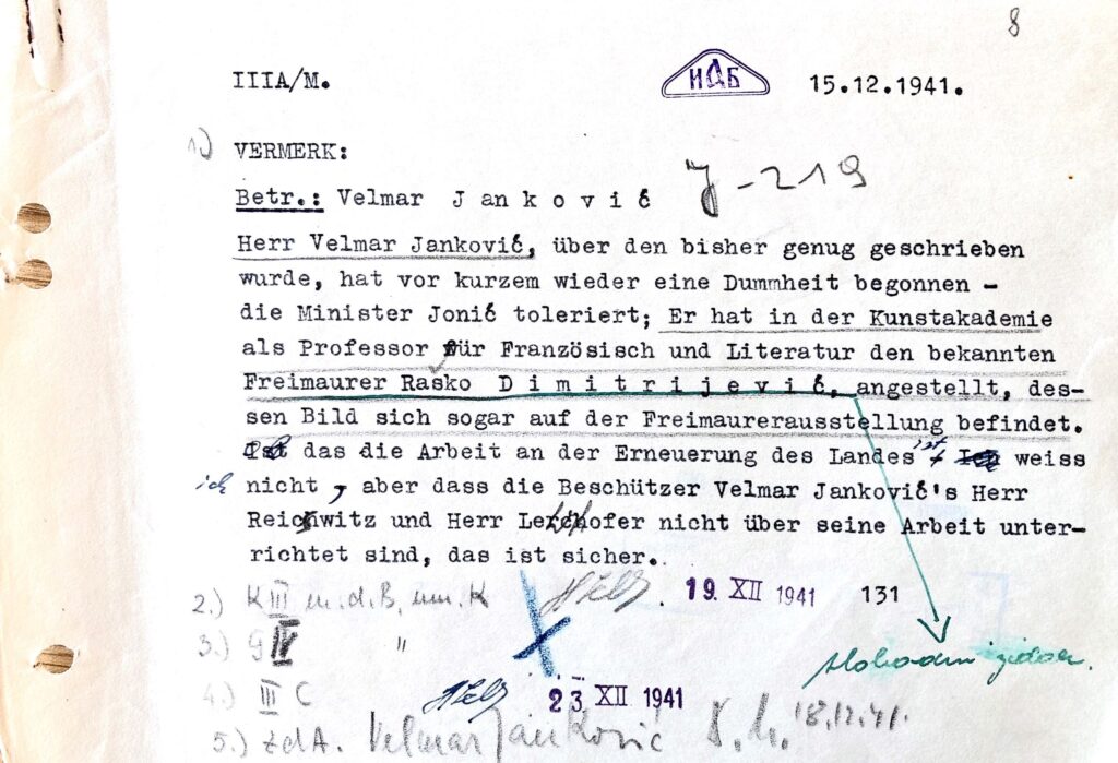 ”G. Velmar Janković, o kojem je dosad bilo dosta reči, učinio je nedavno još jednu glupost koju ministar Jonić toleriše; postavio je u Umetničku akademiju za prof. francuskog i književnosti nikog drugog do poznatog masona Raška Dimitrijevića, čija se slika čak i na izložbi nalazi. Da li je to rad na obnovi zemlje – ne znam, ali da Velmar Jankovićevi zaštitnici g. Rajsvic i g. Lerhofer nisu upućeni u njegov rad. to je sigurno.”